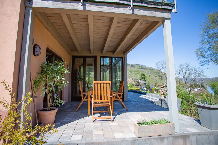 Ein architektonisches Highlight ist die zur Mosel hin vollständig verglaste Fassade, die nicht nur für lichtdurchflutete Räume sorgt, sondern auch einen spektakulären, unverbaubaren Blick auf den Fluss und die umliegenden Weinberge freigibt. Diese Aussicht ist zu jeder Jahreszeit ein Erlebnis und schafft eine Wohnatmosphäre, die ihresgleichen sucht.