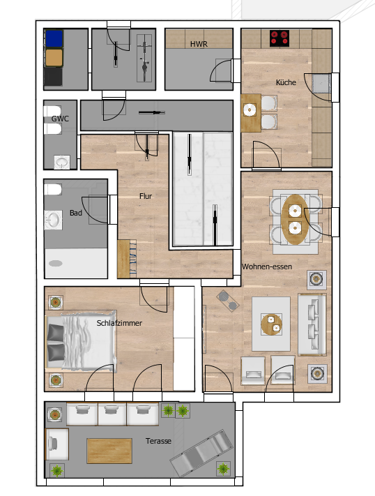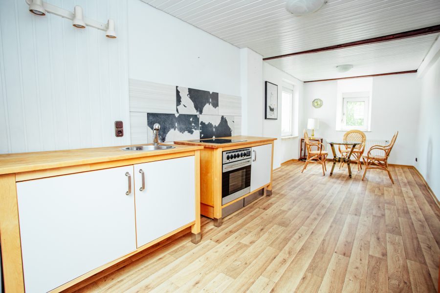 Das zweite Obergeschoss bietet ebenfalls eine Einbauküche mit Wohn-Essbereich, ein Bad und zwei Schlafzimmer. Hier könnte das Dachgeschoss noch als Wohnfläche mit ausgebaut werden.