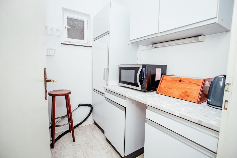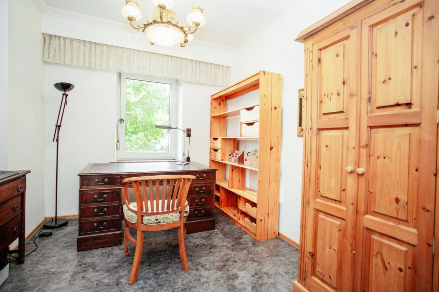 Im Erdgeschoss befindet sich das große Wohnzimmer, zwei weitere Zimmer, von denen eines aufgrund der bereits vorhandenen Anschlüsse ohne großen Aufwand zu einer Küche umgebaut werden kann, sowie ein Gäste-WC. Das WC wurde vor etwa 10 Jahren modernisiert und bietet noch Platz für eine Dusche.