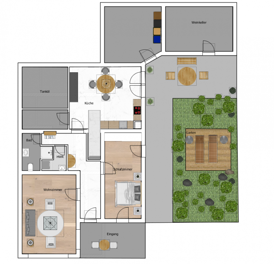 Zum Haus dazugehörig sind 5 Parkplätze und die benannte Garage mit Abstellfläche. Zuletzt kann noch erwähnt werden, dass der neben dem Haus befindliche Garten dazu erworben werden kann. Hier kann man den Tag gut ausklingen lassen und genießen.