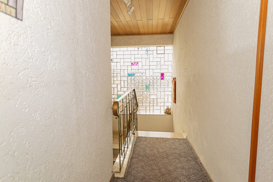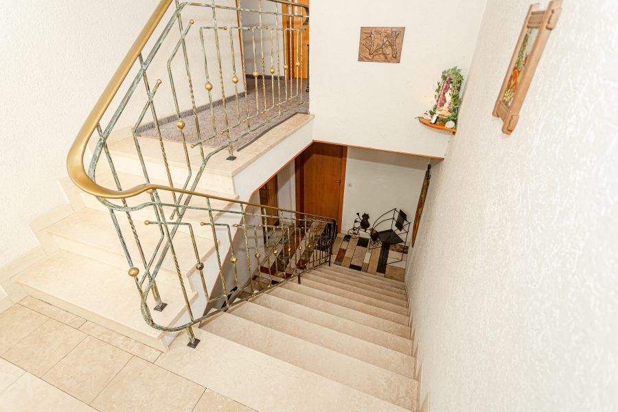 Eine Kunststeintreppe führt ins Obergeschoss zu den Schlafräumen. Insgesamt 4 Zimmer befinden sich hier: 2 Schlafzimmer mit Duschbädern, ein Kinderzimmer und ein weiteres Zimmer, welches ebenfalls als Schlafzimmer oder aber Büro genutzt werden kann. Der Balkon mit Blick zur Mosel ist über den Flur begehbar, die seitliche Terrasse ist über eines der Schlafzimmer zugänglich. Auch diese Terrasse zeigt sich groß und geräumig, hier ist Platz genug für den Grill und die Lounge-Möbel. Hier müssten jedoch Undichtigkeiten behoben werden.