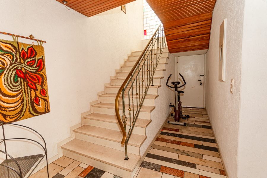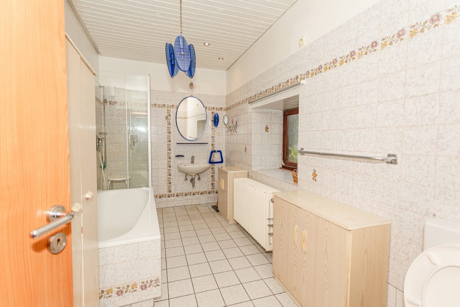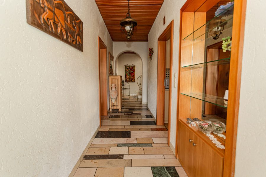 Den Eingangsbereich des Hauses erreicht man über wenige Stufen und das Augenmerk beim Öffnen der Haustür fällt direkt auf die dekorativen Fliesen. Die Wohnungstüren im Erdgeschoss wurden bereits erneuert und zeigen sich in modernem Design. Das Wohnzimmer, mit großem Panoramafenster und Holzvertäfelung an der Zimmerdecke ist sehr großzügig geschnitten und gibt den Blick auf die vordere Terrasse frei. Ein Zugang ist jedoch nur von Außen möglich. Weiterhin befindet sich eine große Küche im Erdgeschoss, hier hat man einen offenen Essbereich geschaffen, der aber mittels Glasschiebetür separiert werden kann. Das große Badezimmer verfügt über ein Außenfenster und ist mit Dusche und Badewanne ausgestattet.
