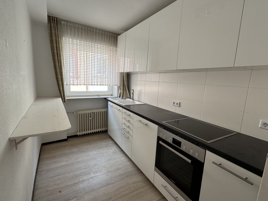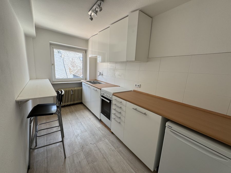eine voll ausgestattete Küche mit kleiner Esstheke und einen kleinen Flur mit offenem Durchgang zum geräumigen Wohnbereich mit Stabparkettboden. Das große Fenster im Wohnbereich offenbart einen wunderschönen Blick auf die Mosel.
